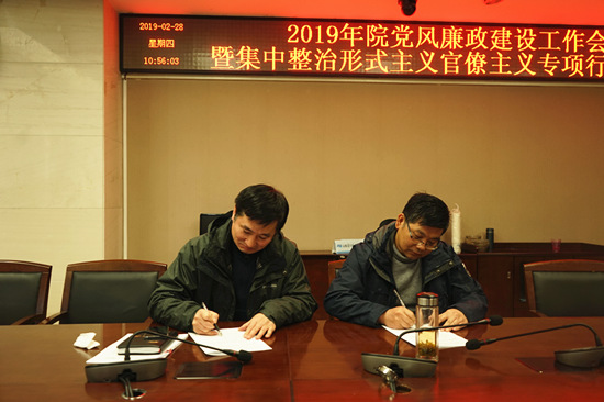 會上,張峰書記代表院黨委與院領導班子成員和各部門負責人分別簽訂了黨風廉政建設責任書,并帶領全體參會人員進行了廉政宣誓。